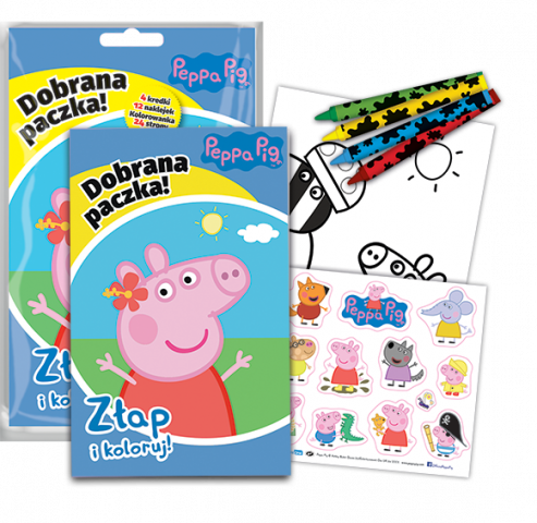Wyjątkowy zestaw dla najmłodszych fanów rezolutnej świnki i jej rodzinki. W środku dziecko znajdzie 4 kredki, 12 naklejek oraz 24-stronnicową kolorowankę.